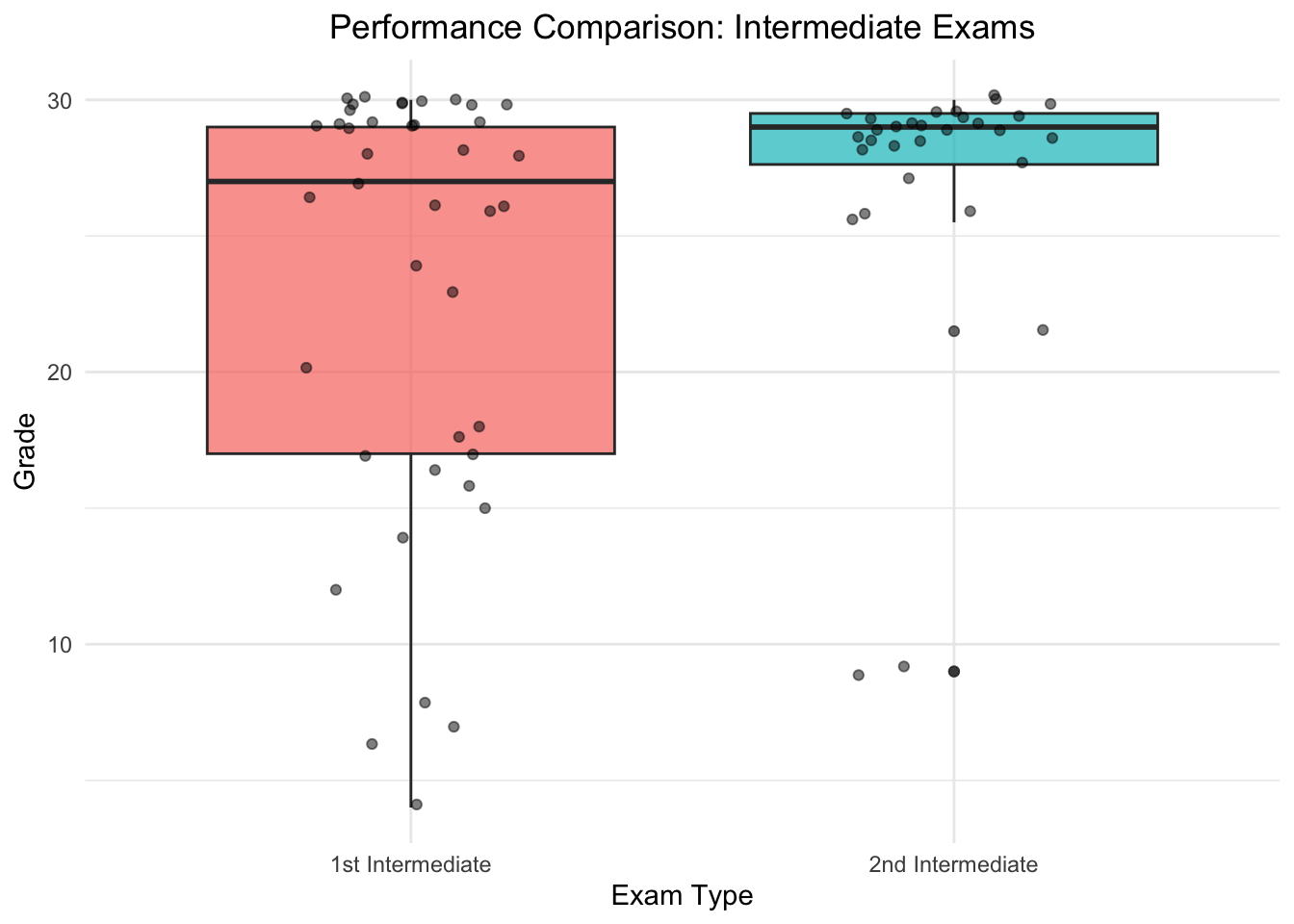Intermediate Exams: Students performed similarly on both intermediate exams, with slight variations.