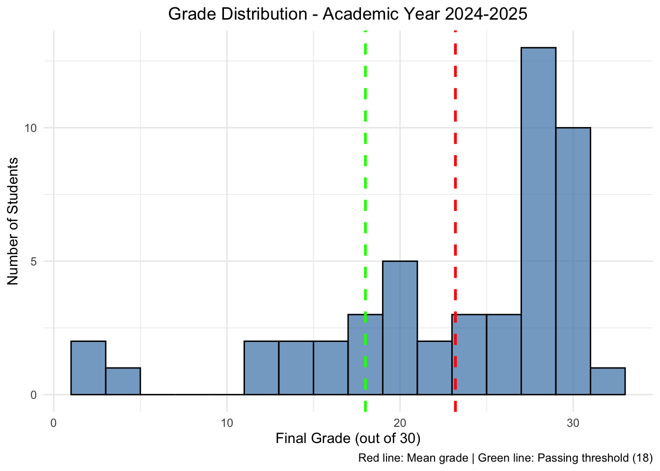 Overall Performance: The mean final grade for the 2024-2025 academic year was 23.2 out of 30.