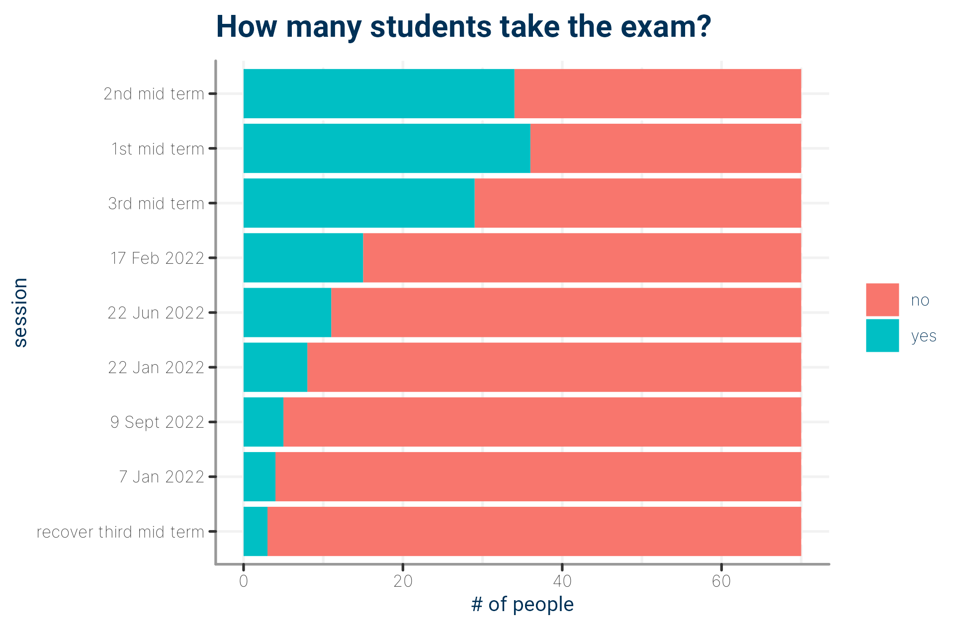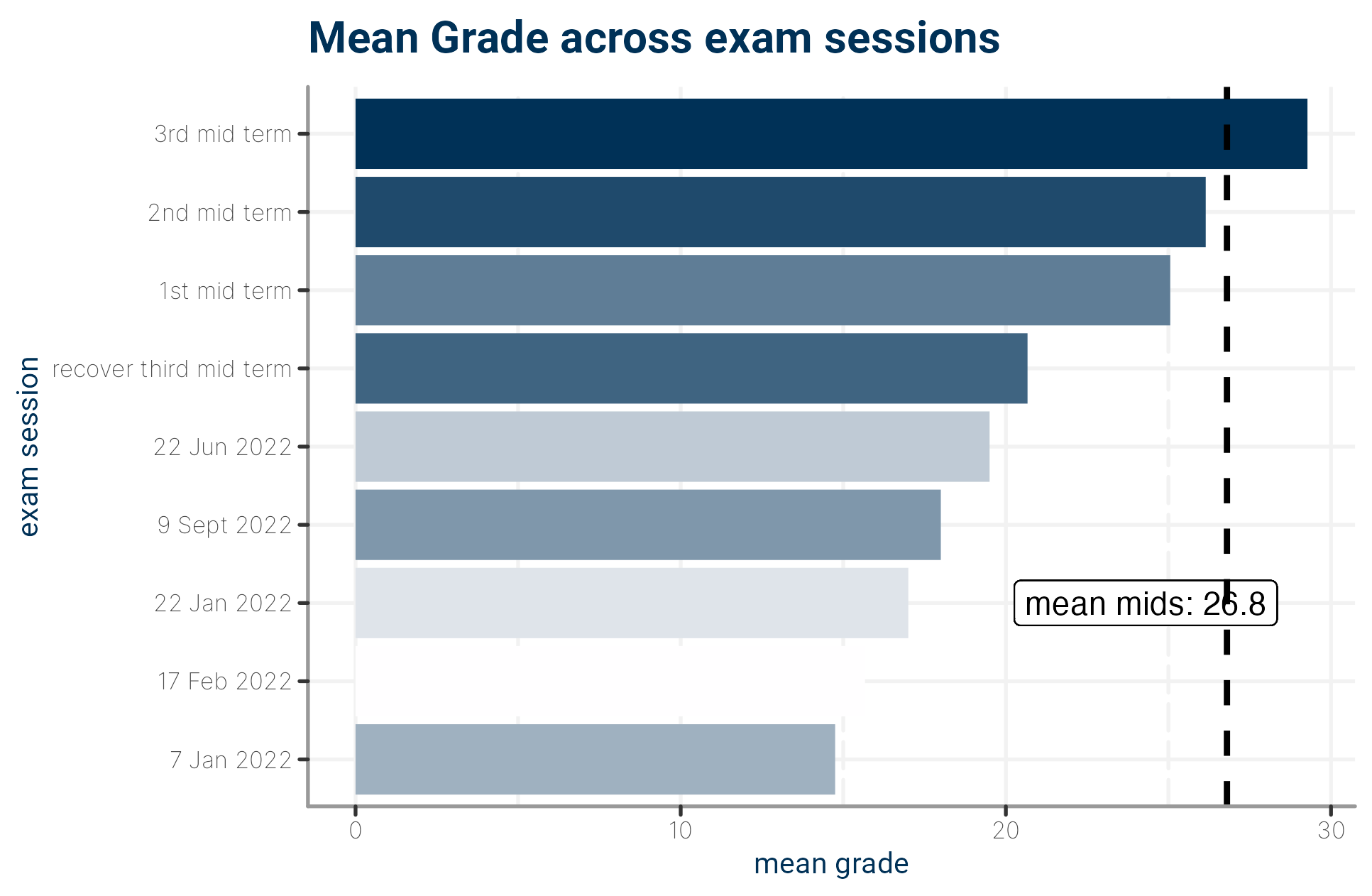 In this place you can have a grasp on how your previous colleagues performed on past years in this course. Hopefully this will inspire you to do better and challenge your grade expectation. Data is extracted by Blackboard and have been carefully anonymized and securely stored to preserve privacy.