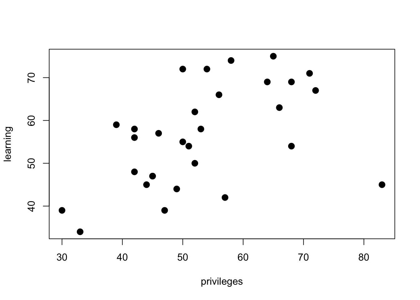 Let’s have a look at an example in R using the Chatterjee-Price Attitude Data from the library(datasets) package. The dataset is a survey of clerical employees of a large financial organization. The data are aggregated from questionnaires of approximately 35 employees for each of 30 (randomly selected) departments. The numbers give the percent proportion of favourable responses to seven questions in each department. For more details, see ?attitude. We take a subset of the attitude dataset and consider only two variables in our K-Means clustering exercise i.e. privileges learning.