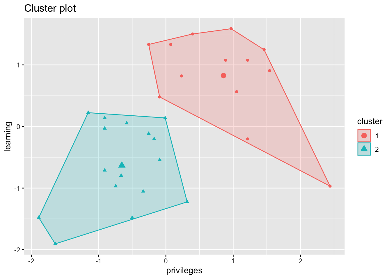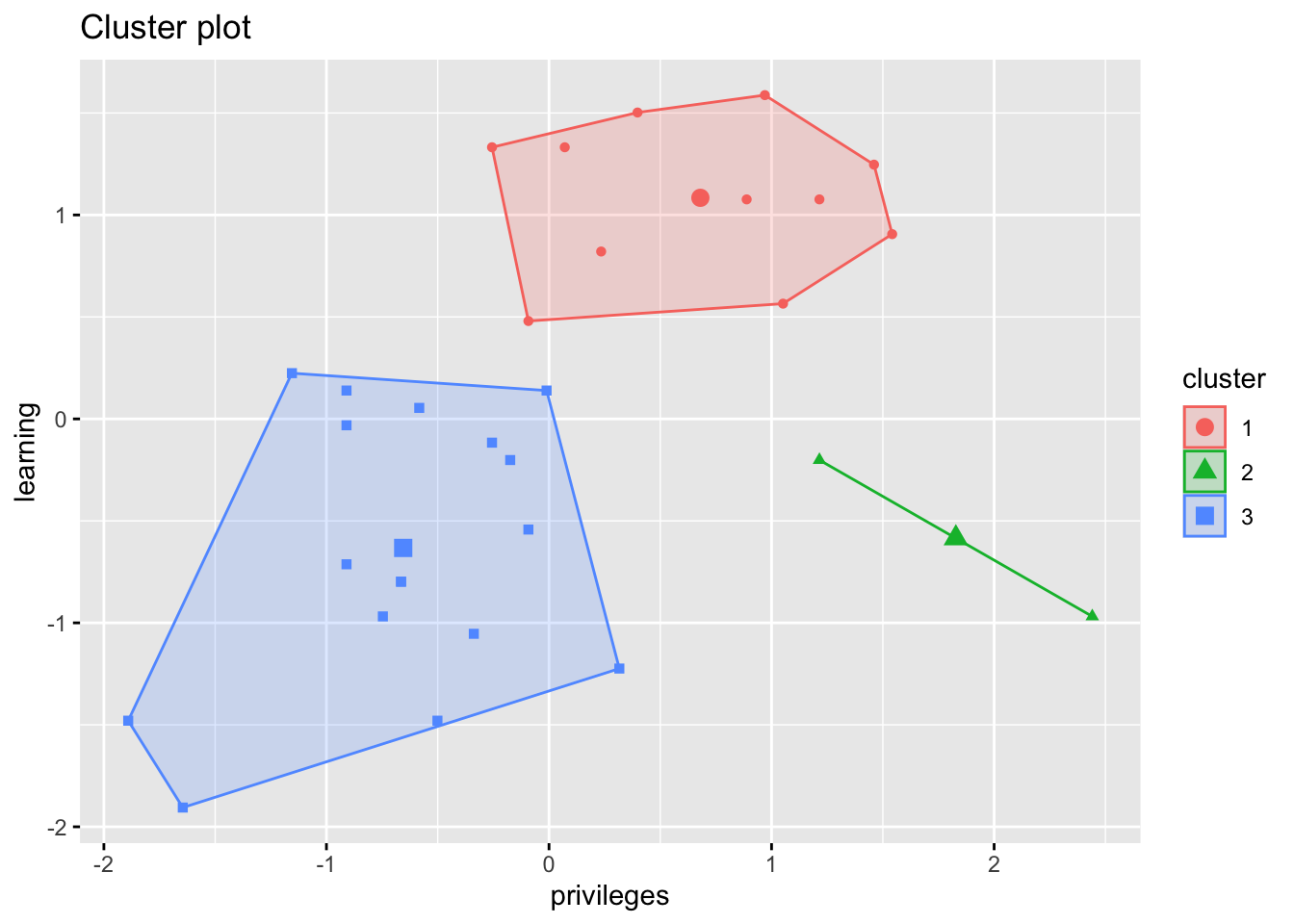 - visualize privileges and learning in a scatterplot. Do you see any cluster?