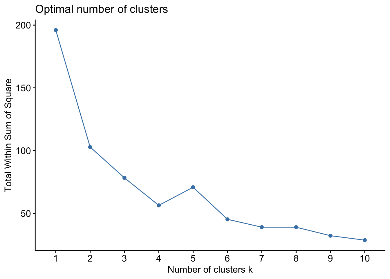 where \(C_k\) is the \(k\)th cluster and \(W(C_k)\) is the within-cluster variation. The total within-cluster sum of square (wss) measures the compactness of the clustering and we want it to be as small as possible. Thus, we can use the following algorithm to define the optimal clusters: