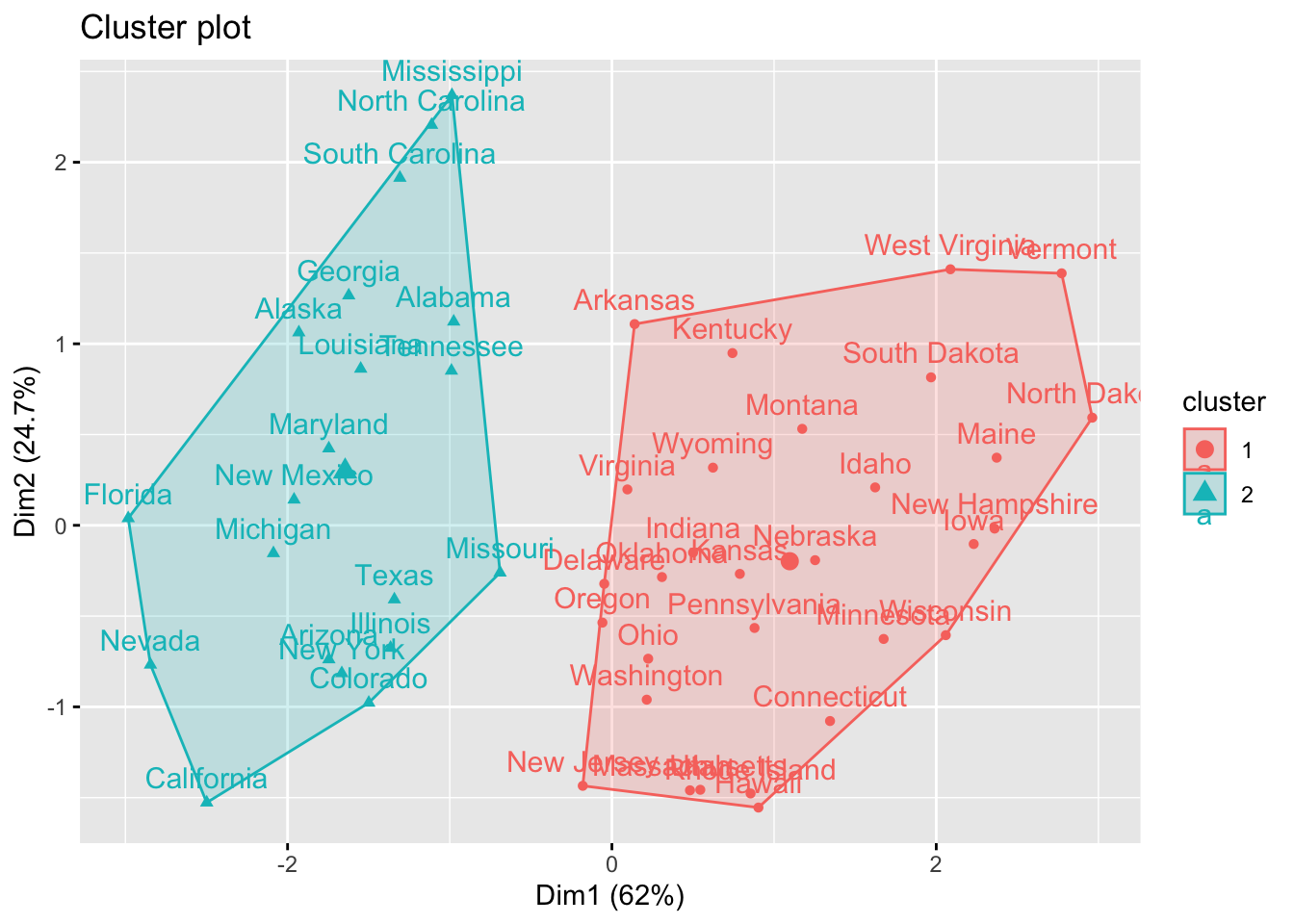 k2 <- kmeans(scale_USArrests, centers = 2, nstart = 25)