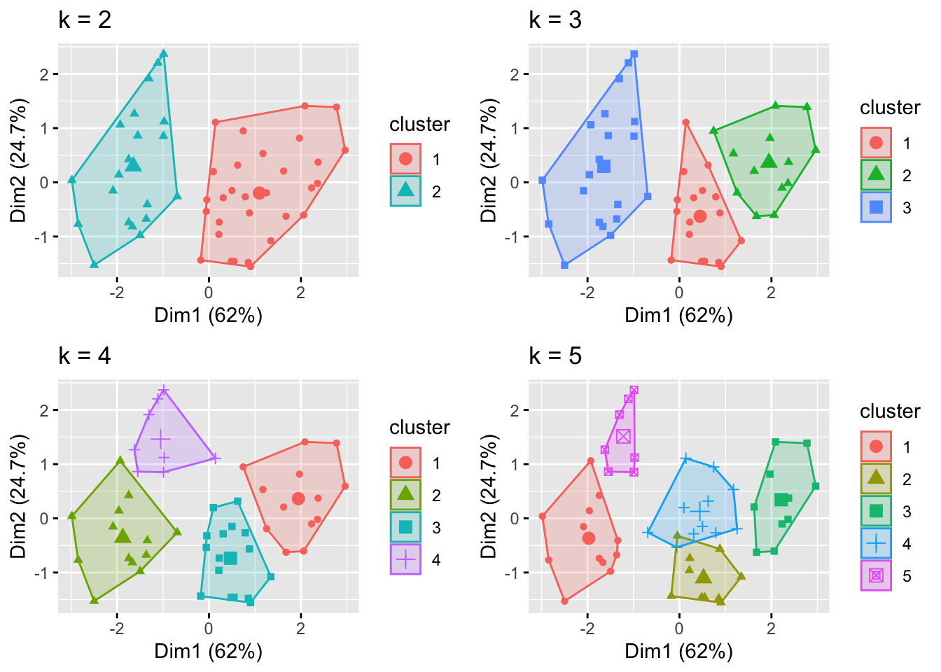 Remember also that if you want to visualize clusters you may think to use fviz_cluster() from lib factoextra. You can also use the ggplot2 package calling the autoplot function on the kmean regression. We are going to use the same dataset USArrests. We are scaling data because we don’t want the clustering algorithm to depend to an arbitrary variable unit, we start by scaling/standardizing the data using the R function. This could/should be done also for hierarchical cluster. Please note also that if you want to consistently reproduce results across you need to set the seed to a specific number with set.seed(28)