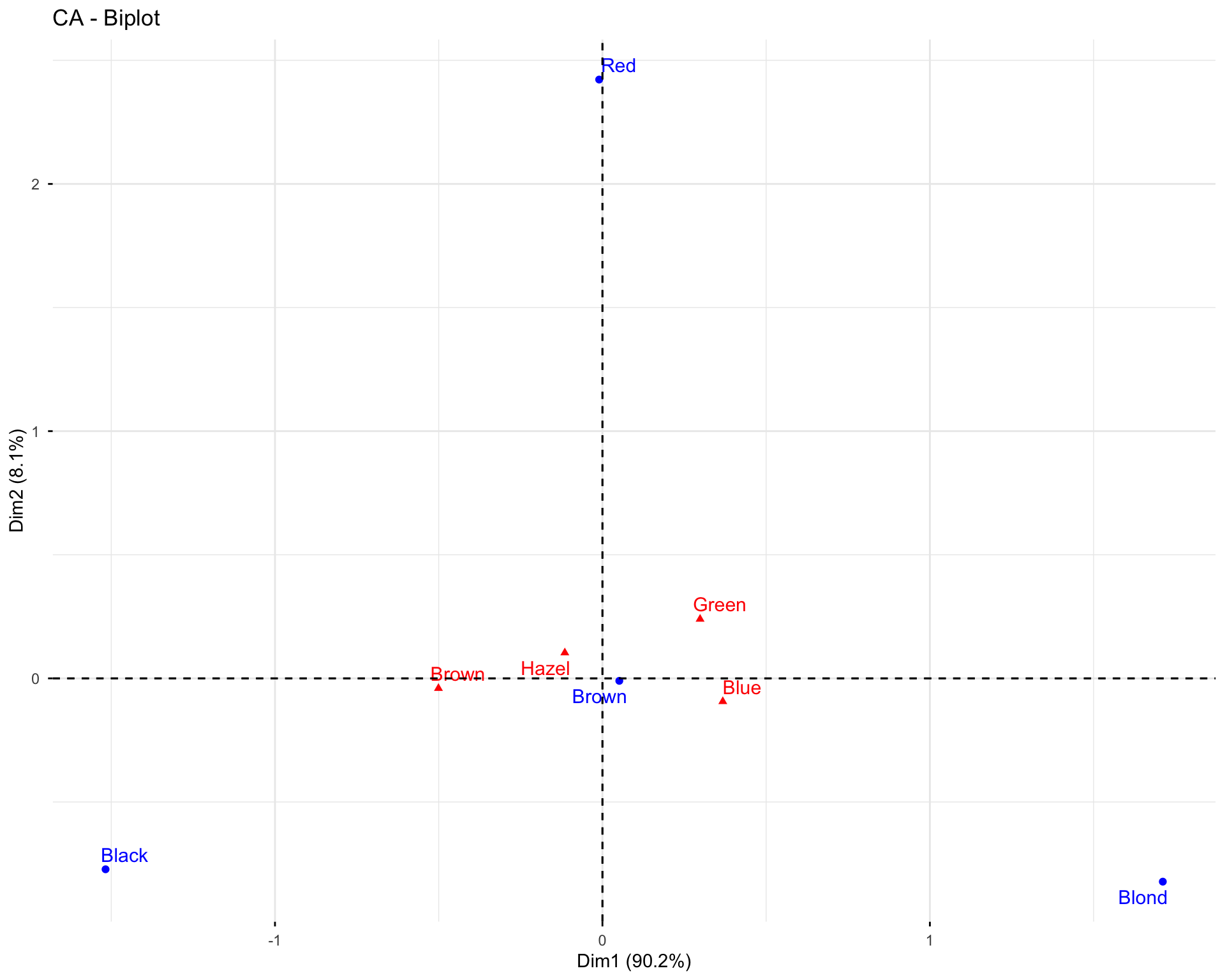 ✅ CA: - Understand when to use CA (categorical data in contingency tables) - Perform CA using FactoMineR - Interpret row and column coordinates - Understand the relationship between CA and chi-square test - Visualize and interpret CA results - Understand the difference between symmetric and asymmetric plots