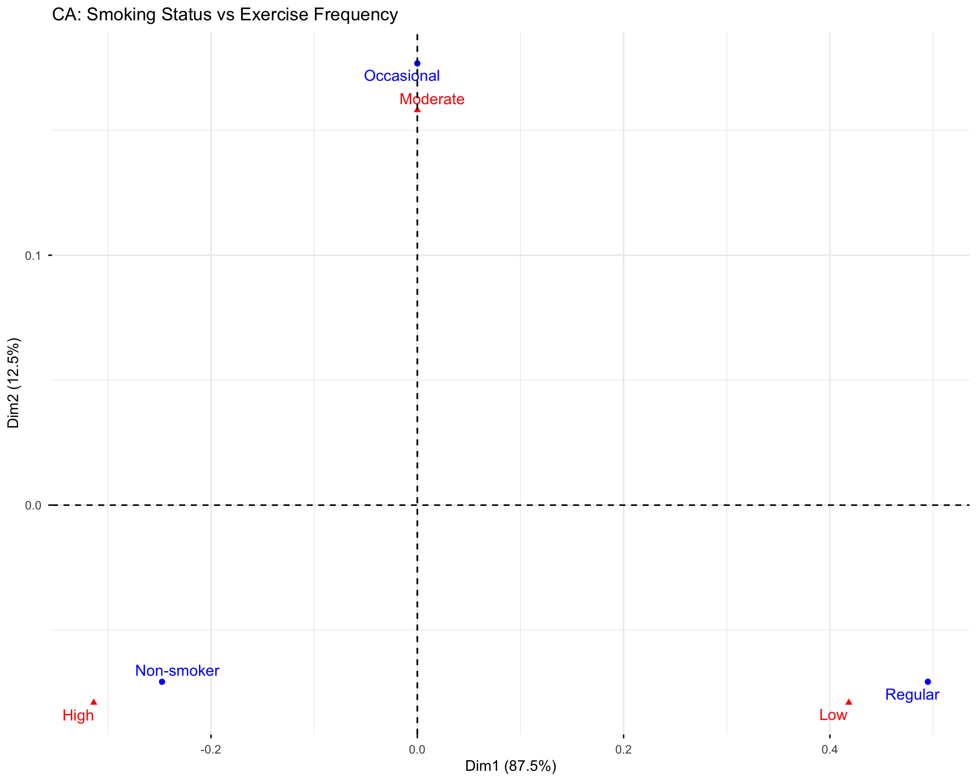 #> Low 14.286 0.034 |Questions: 1. What associations do you see between smoking and exercise? 2. How would you interpret the dimensions? 3. What insights can you draw from this analysis?