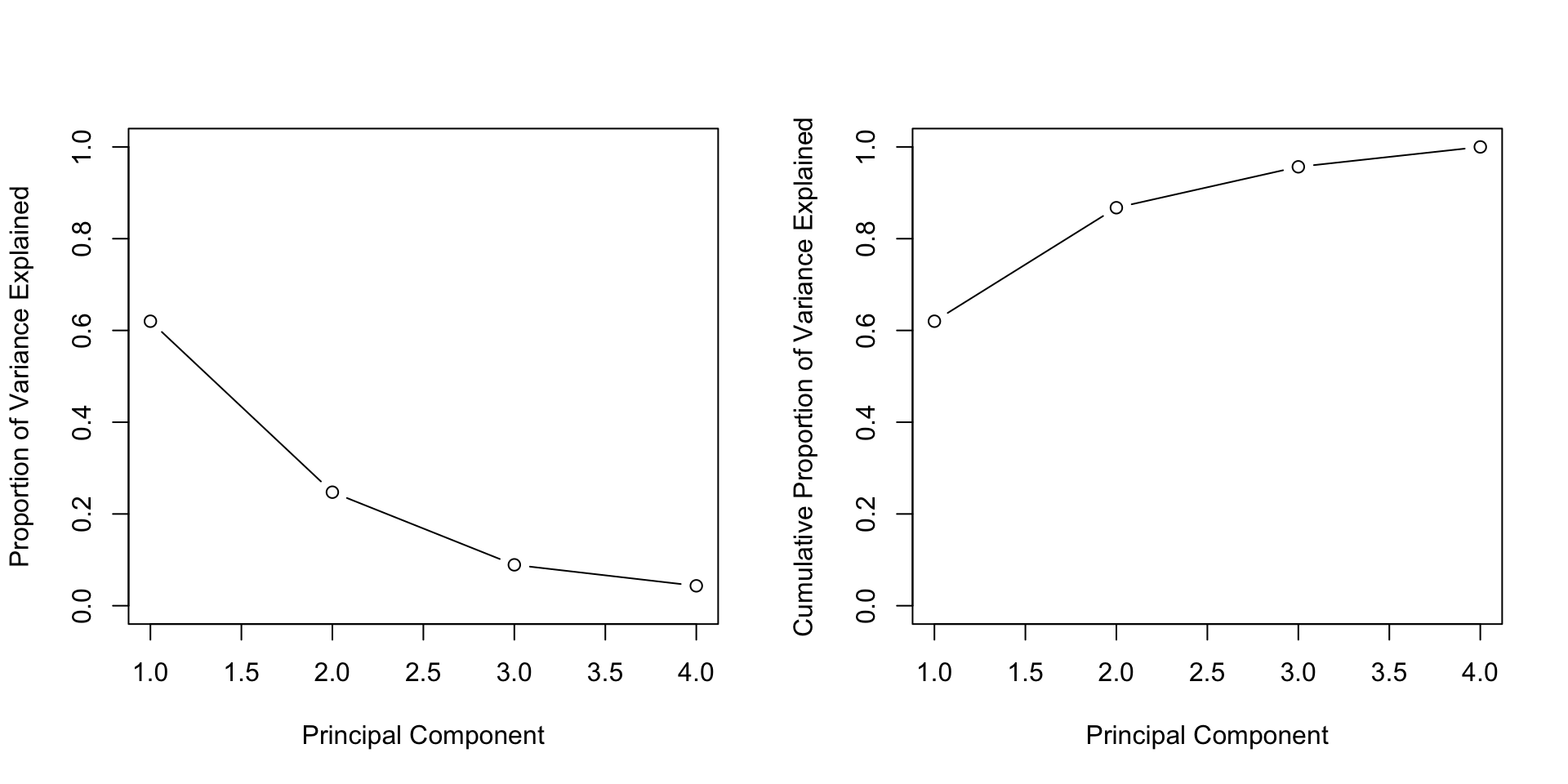 #> [1] 0.62006039 0.24744129 0.08914080 0.04335752We see that the first principal component explains 62.0% of the variance, and the next explains 24.7%. Let’s plot the PVE (Proportion of Variance Explained) and cumulative PVE: